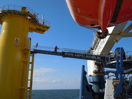 To date, Ampelmann has produced a total of eight access platforms, leased to customers who operate them all over the world. It has been proven in practice that these platforms can be successfully deployed in sea states of up to +/- 3 m (+/- 9.8 ft) depending on where the platform is mounted on the vessel. The most effective location is the centre of the ship as this minimizes the influence of pitch and roll on the motion of the platform.