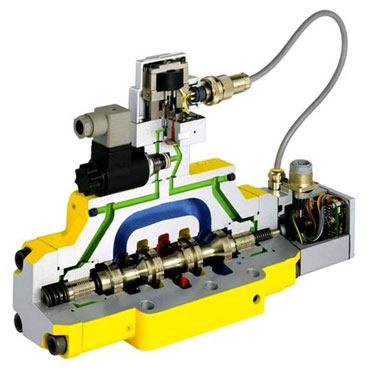 A Moog D663 series valve sectioned to show the solenoid operated failsafe mechanism. This device allows the spool to move to a ‘pre-determined’ safe position, under the influence of a spring detent, when the electrical supply is lost for any reason.