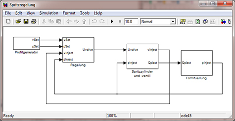 Simulation model of the injection unit in Matlab/Simulink with the sub blocks command signals, controller, injection axis with valve and mold. Source: Sumitomo (SHI) Demag
