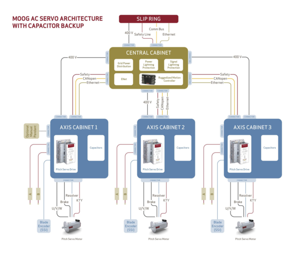 Moog’s AC Pitch Technology continues to advance to meet the requirements of wind turbine customers. Moog engineers designed a more compact and far less complex modular AC architecture through intelligent use of distributed control. This reduced the overall number of separate components in the system to increase its reliability. Moog’s continuing focus on pitch system modularization helps drive cost savings by optimizing the engineering, manufacturing and service effort. The intensive qualification and testing on the system and module level results in less downtime and higher productivity for turbine manufacturers and operators – as well as lower energy costs.