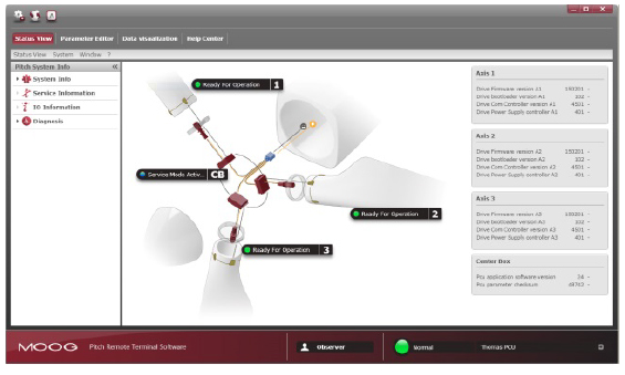 The Remote Terminal Software can be accessed by both Moog engineers and the customer’s service personnel using a single GUI (Graphical User Interface). Based on a proven architecture, the software offers users the ability to remotely diagnose the operational condition of the pitch system, plan for preventive maintenance actions or perform troubleshooting with integrated tools like the remote software oscilloscope. The integrated condition monitoring functions provide early diagnoses of potential issues which is critical to reducing turbine downtime. The tool also helps operators plan on-site service work, allowing for effective and targeted maintenance.